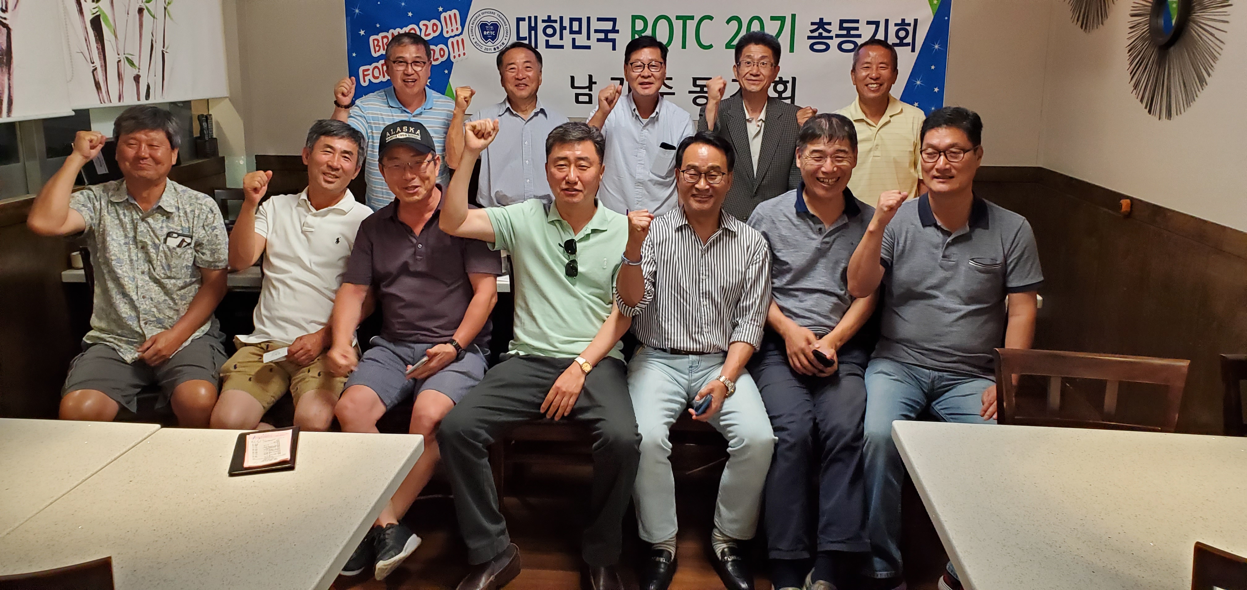20기 정기 모임 이승용 /20기/성균관대 1 16506 2019.08.06 01:13 20기는 2019년 8월 3일에 알티시아에 있는 명동 순두부 2호점에서 올해 세번째 정기 모임을 했습니다. 12명의 동기들과 4명의 동수분들이 참석해서 즐거운 시간을 가졌습니다. 각종 한식과 맛있고 시원한 냉면으로 더운 여름날의 하루를 보냈습니다. 18일에 있는 남가주 ROTC 총동지회 야유회에서 다시 만나기로 했고, 조만간 여러 동기들의 의견을 모아 네번째 모임을 하기로 했습니다. 무더운 여름 건강 유의하시고 즐거운 날 보내십시오. 남가주 ROTC 20기 동기회장 허 종환