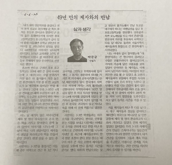 삶과 생각 -49년 만의 제자와의 만남(수필가 박문규 7기)